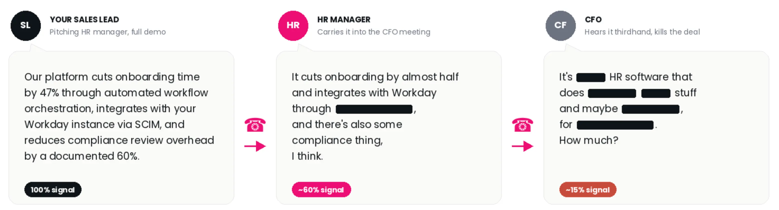 Every deal required a CFO's signature, and HR managers bringing the concept upstairs were working with materials designed for a more technical audience. The sales team had focused too much on difficult details and made too many assumptions about leadership’s familiarity with the problem. As a result, it didn’t translate to the executive, and the deal fell flat.