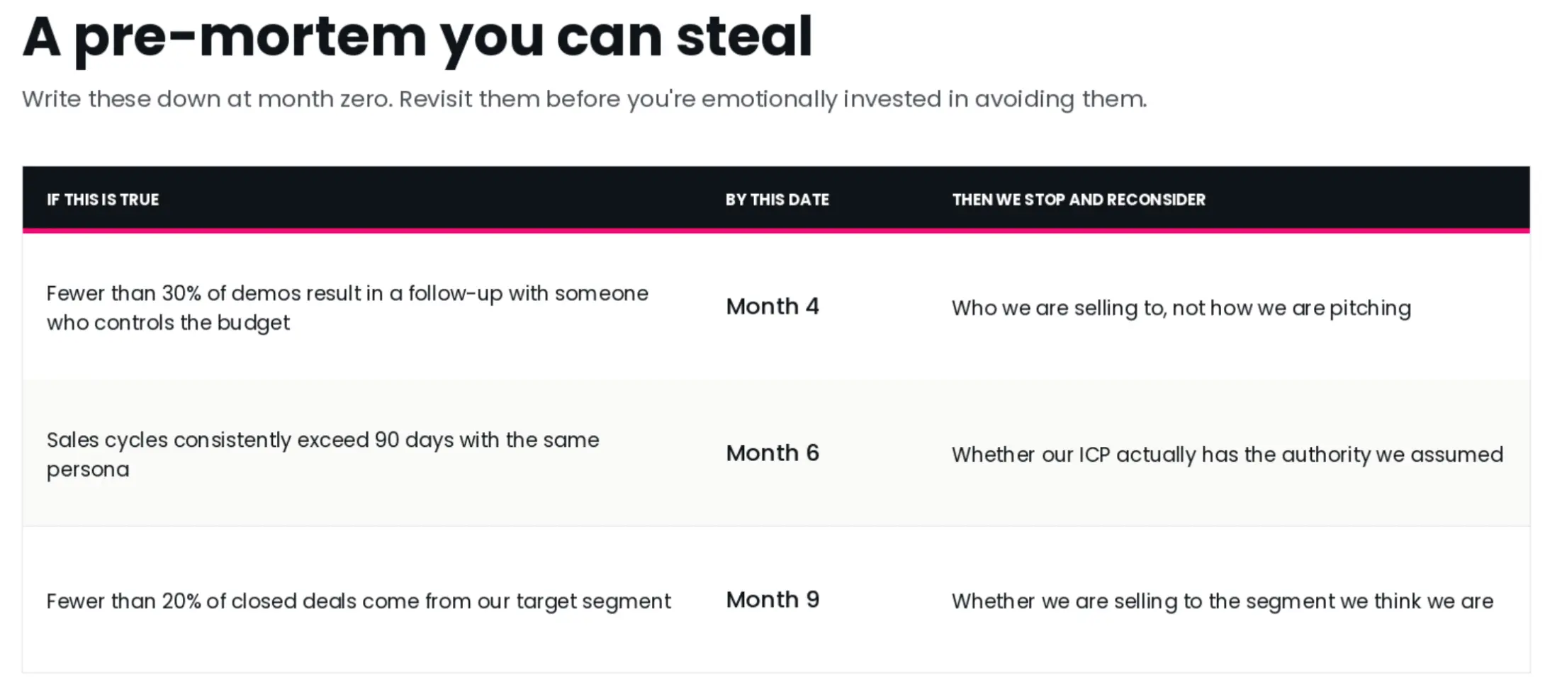 Most teams set targets, but far fewer set the conditions under which they’d stop and ask whether the entire premise is pointing in the right direction. When a number is bad, and you have pre-agreed criteria for what “bad” means, the conversation becomes much cleaner. For example, if fewer than 30% of our demos result in a follow-up with someone who controls the budget, you stop optimizing the pitch and revisit who you're selling to. Without that framework, teams tend to default to changing tactics because it feels like the most direct action they can take.