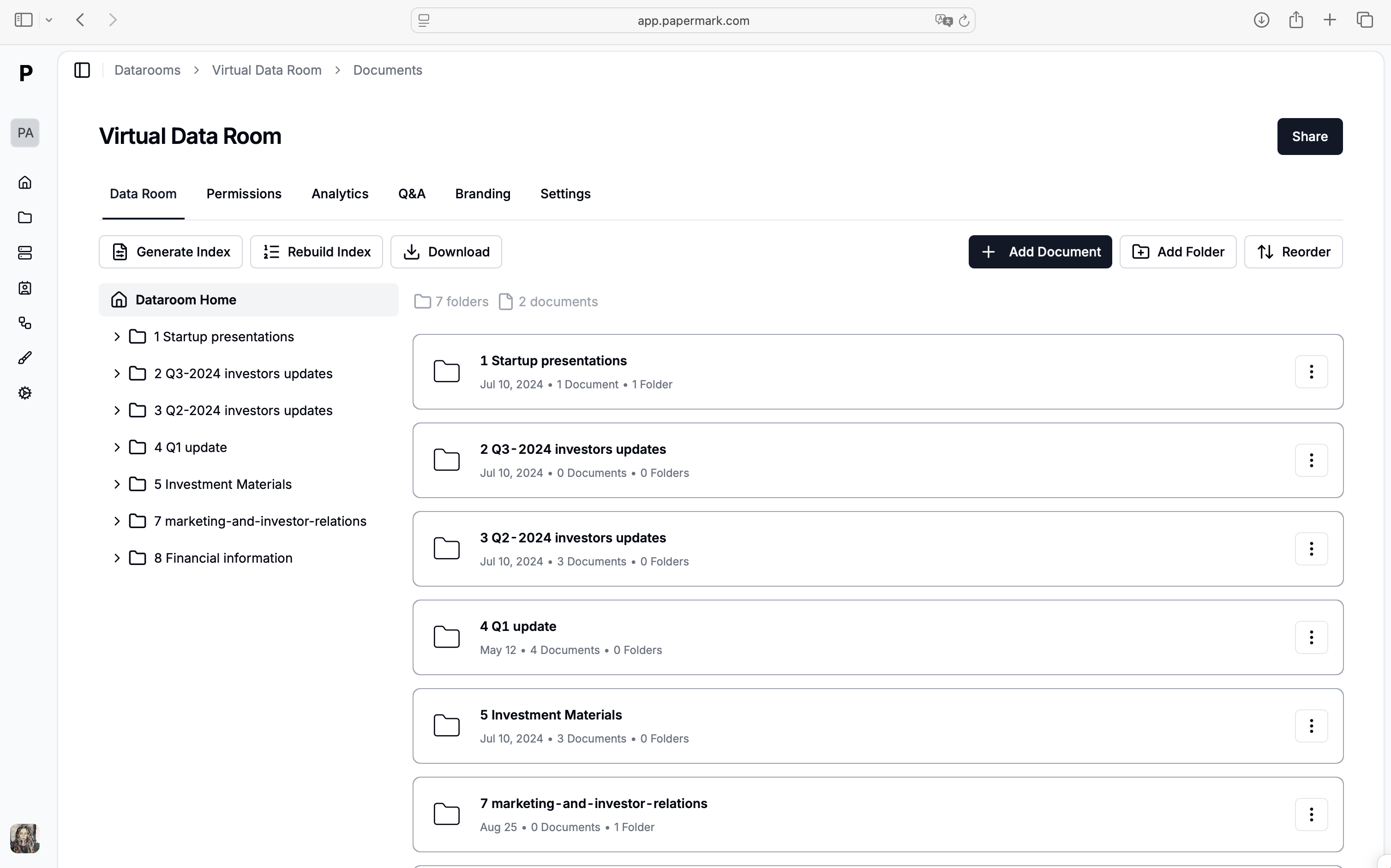 If you want something more purpose-built than Drive without jumping to a heavyweight enterprise VDR, Papermark's Virtual Data Room is a strong middle ground for early-stage teams. It gives founders page-level analytics, granular access controls, and secure link permissions so you can actually see how investors engage with your materials.